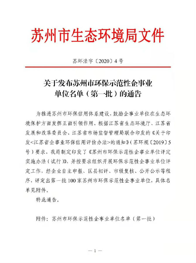 福泰獲得蘇州市環保示范性企事業單位